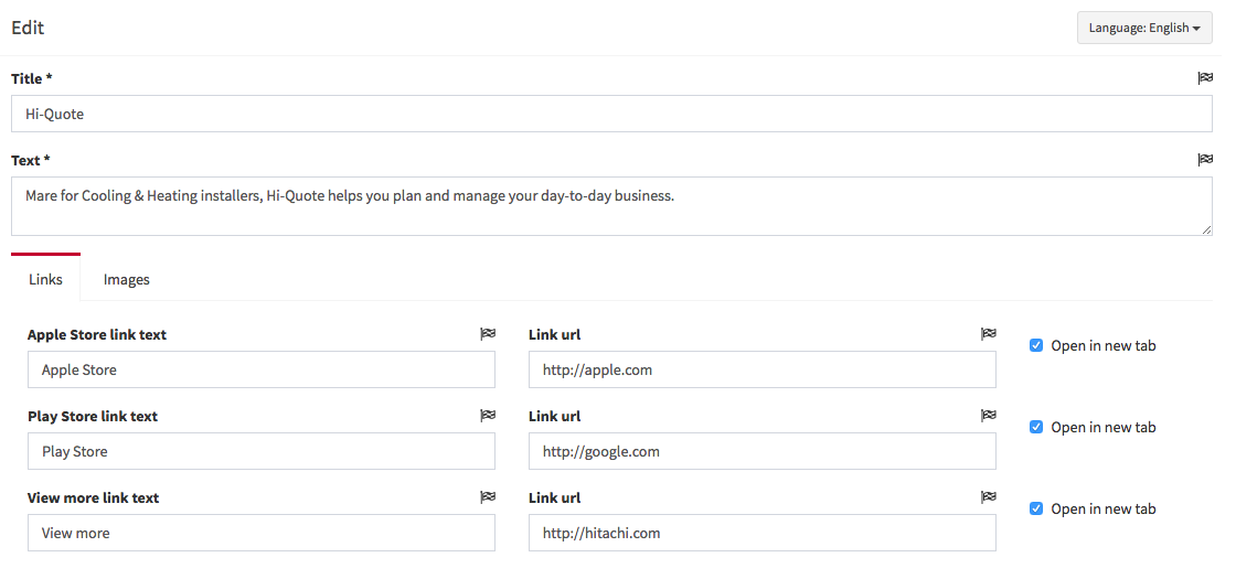 For each app, enter a title, text description and image. You also need to provide links for downloading the apps. These could be the Apple AppStore, Google Play or Hitachi.